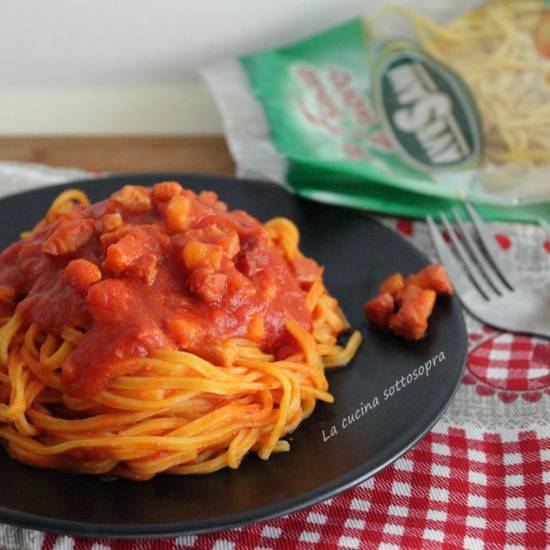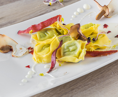 Fate dorare nel burro la cipolla e l’aglio tritati molto finemente, aggiungete il filetto tagliato a strisce e fate rosolare bene. Ora aggiungete i funghi tagliati a fette sottili o anche a striscie e la pancetta.